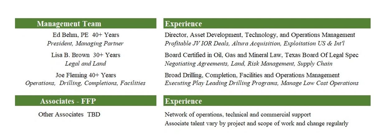 The management team has the skills and network that fit crafting effective development drilling JVs and successful IOR projects. When and where necessary, for each project, we will bring onboard the right team of associates to deliver expected outcomes and results in the time and cost required.
